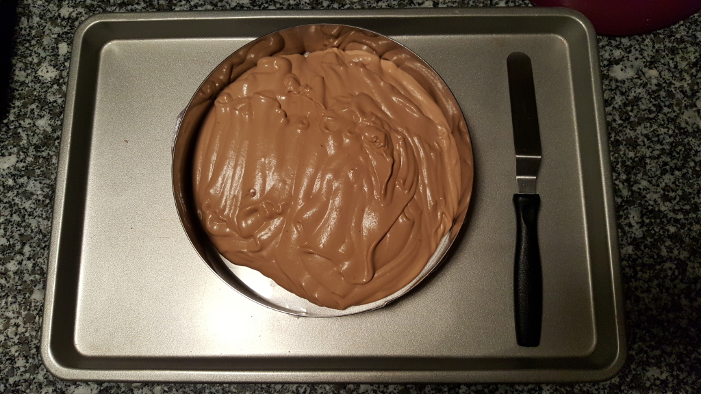 Nous allons procéder à un montage à l’envers pour avoir une surface parfaitement lisse. Filmer un cercle à mousse de 20 cm de diamètre. Il faut que le film soit parfaitement tendu. Poser le cercle côté filmé vers le bas. Verser la mousse au chocolat dans le cercle en plusieurs fois afin d’éviter les bulles d’air. On s’aide d’une spatule coudée pour bien répartir la mousse. Remplir jusqu’à 0,5 cm du haut du cercle. Sortir le biscuit du congélateur. Le déposer coté praliné sur la mousse. Appuyer légèrement pour le mettre à fleur du cercle en enlevant la mousse qui remonte sur les côtés. Réserver au congélateur pour au moins 6 h.