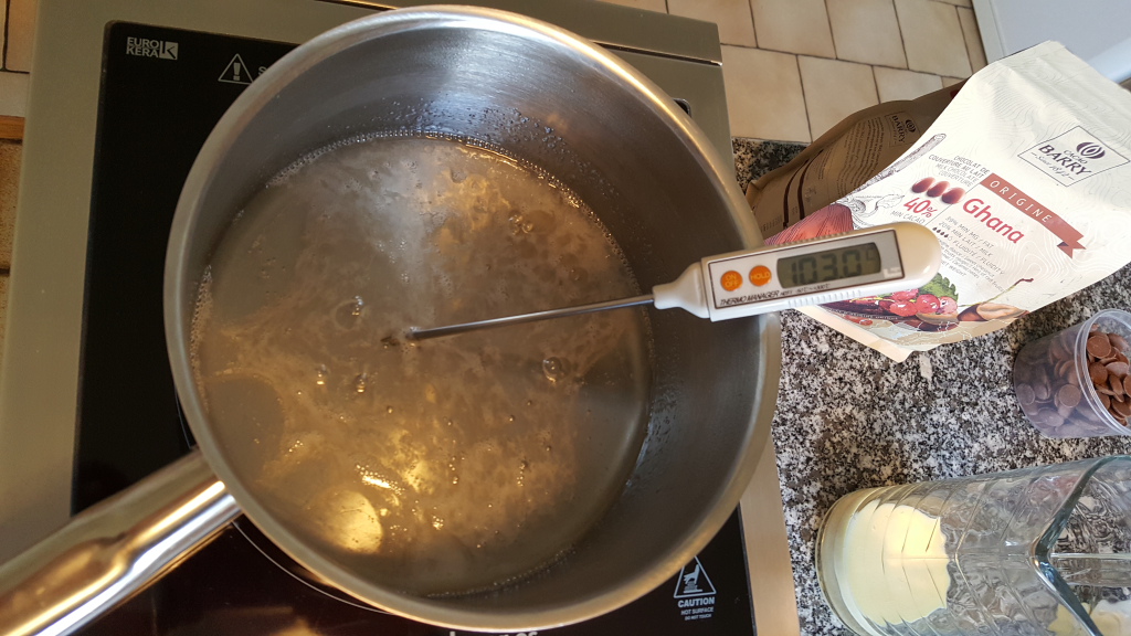 Dans un pichet, mettre le lait concentré sucré. Faire un sirop avec l’eau, le sucre, le glucose et le cuire à 103°C. Le verser dans le pichet. Mettre le chocolat et la masse gélatine fondue au micro onde. Mélanger tout d’abord doucement à la spatule et mixer avec un mixeur plongeant. L’important est de ne pas incorporer la moindre bulle d’air.