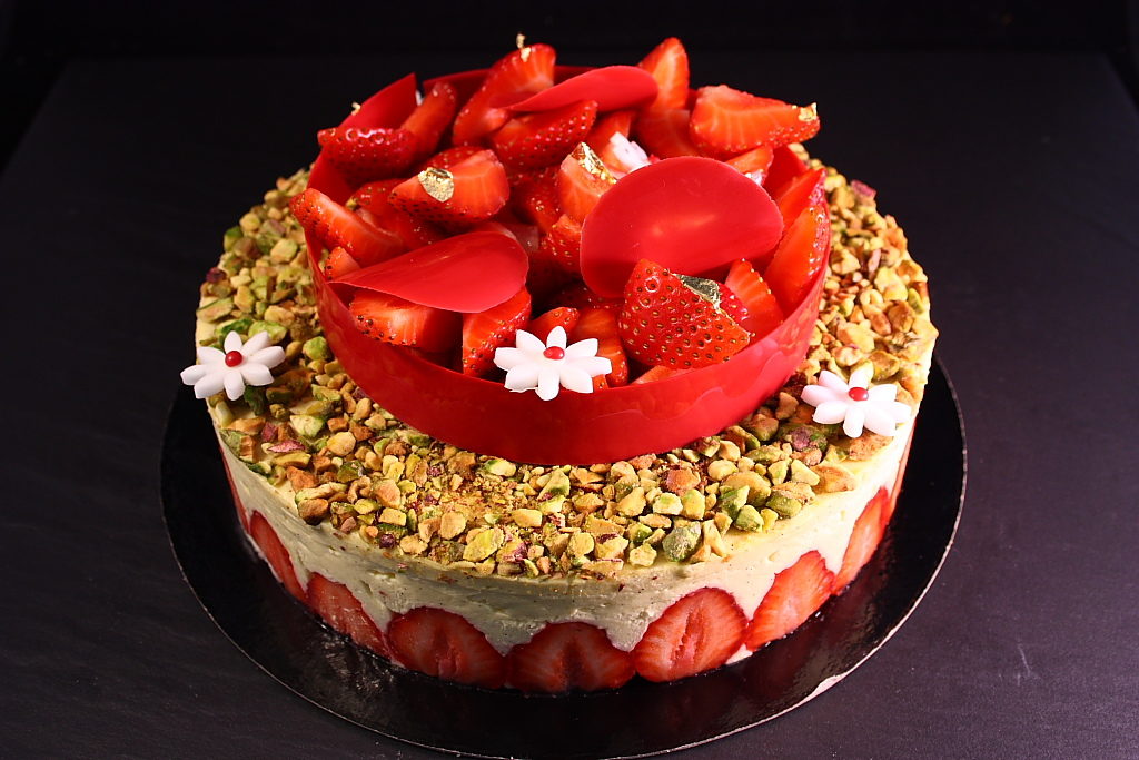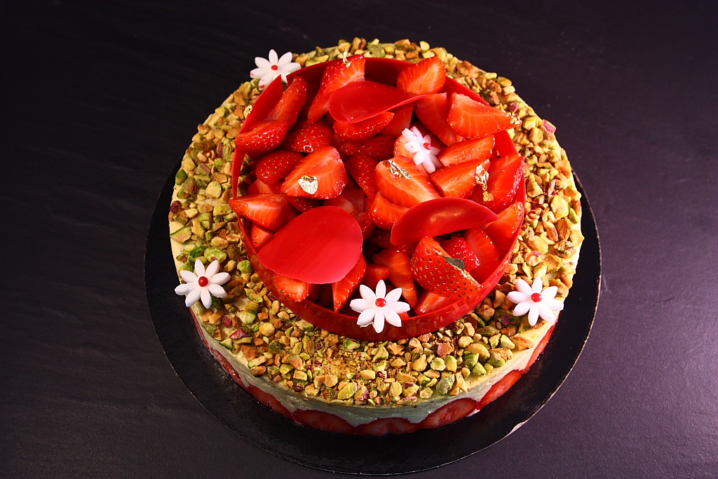 Poser le cerclage rouge au centre. Disposer des fraises coupées en 4 à l’intérieur du cerclage. Parsemer l’extérieur de pistache hachées. Déposer vos disques de chocolat rouge sur les fraises. Réaliser des marguerites en pâte d’amandes à l’aide d’un emporte pièce à ressort. Disposez-les harmonieusement. Donner de l’élégance à votre fraiser en y déposant une pointe de feuille d’or.